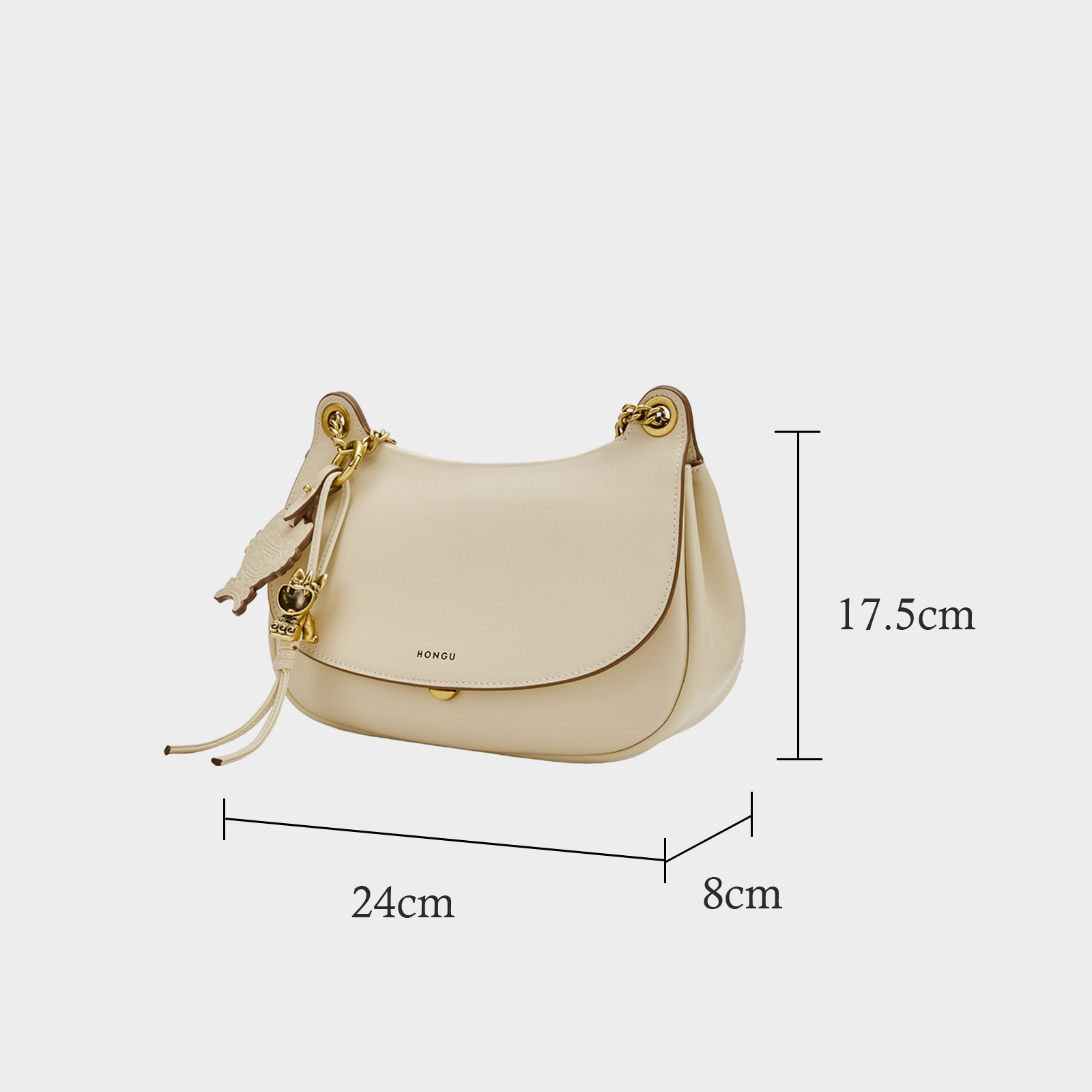 Intangible cultural heritage craftsmanship, vividly presented on the bag: Three-dimensional ancient gold Wamao hardware pendants, all drawing on the essence of traditional Yunnan Wamao shapes, are designed by intangible cultural heritage artisans. With exquisite three-dimensional casting techniques, they restore the dynamic charm of Wamao. The ancient gold color accumulates the texture of time, allowing intangible cultural heritage to be brought to life in modern fashion in a wearable and collectible way. It is not merely a decoration but a walking intangible cultural heritage work of art. The arc of the cat ears on the bag body, combined with the smooth lines of the saddle bag, gives the overall shape of a cat's head, which is both cute and elegant. The long shoulder straps made of metal chains on the cat ears add a touch of liveliness. The metal Wamao and leather pendants fully enhance the cuteness of the Wamao and convey the spirit of protection.