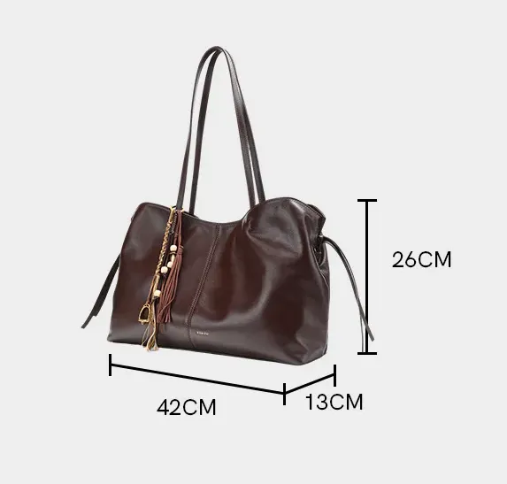 The tassel + metal lock + beaded charm ensemble serves as the pièce de résistance: earthy-toned tassels harmonize with the leather’s hue, while metallic accents inject refined contrast. With every movement, these delicate adornments dance with effortless grace, transforming a timeless silhouette into an instant statement.